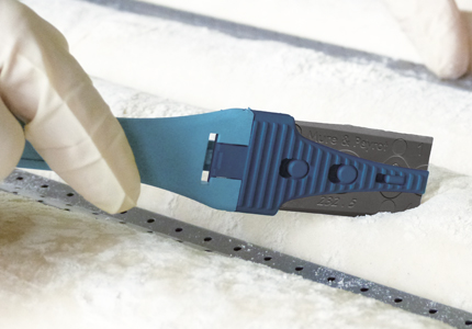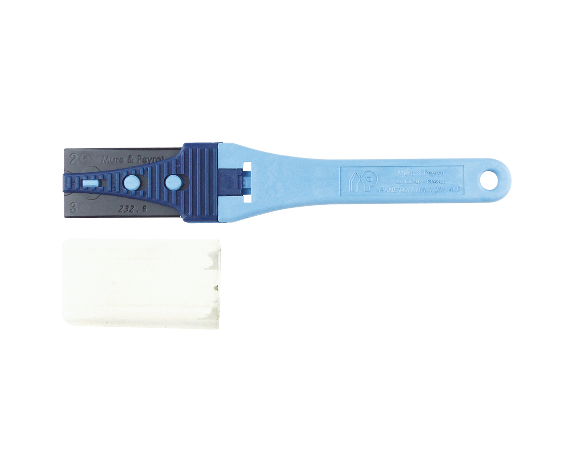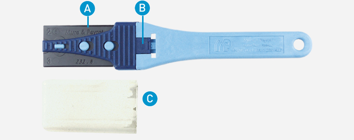 A : Plastic blade. B : Removable tab for blade change. C : Protection cap.