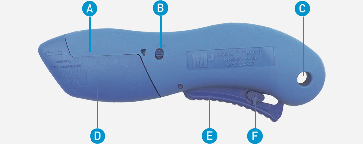 A : Ergonomic handle. B : Hatch unlocking catch. C : Can be hung from the Zicou. D : Removable front flank of the knife to access the blade. E : Trigger. F : Safety slider to lock the trigger.