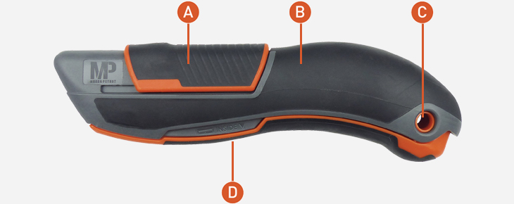 A : Anti-slip and serrated cursor in bi-material. B : Bi-material body. C : Can be hung from the Zicou