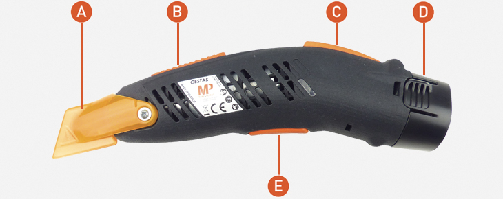 A: Removable protection flap during cutting. B: Protection flap release slider. C: Upper power trigger. D: Battery. E: Lower power trigger