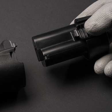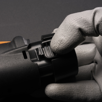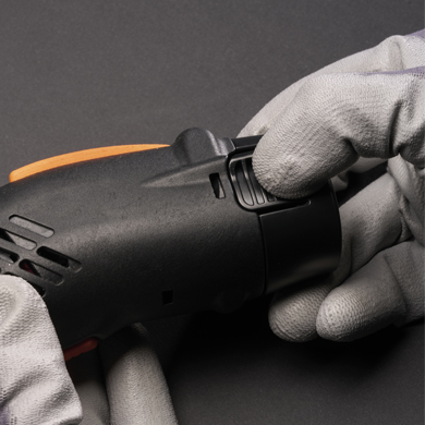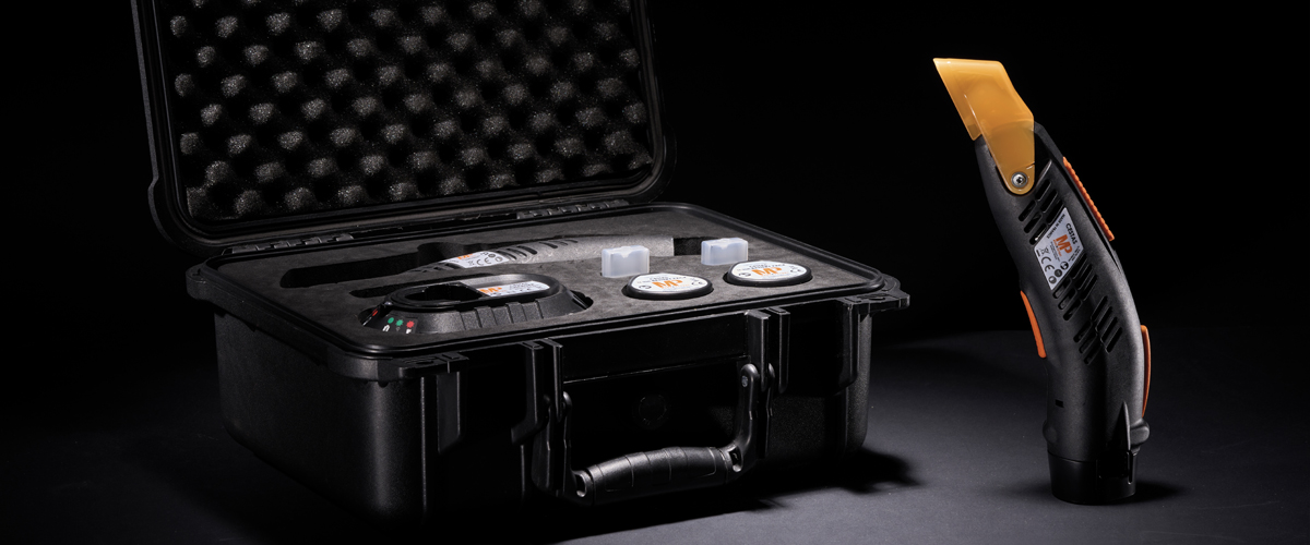 The CESTAS comes in a sturdy carrying and protective case. In addition to the knife, it contains the battery charger, 2 batteries (so the user always has a charged battery available), and 2 boxes of 10 blades (Ref. 663.9.2). With the CESTAS, we wanted to provide a fully complete tool for the user, always ready for use. Changing the battery is very simple: just unclip the battery pack at the back of the knife and pull it towards you to release it.