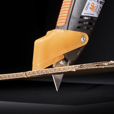 Integrating electric power into the knife provides strength and consistency, offering assistance for even the most challenging cuts: thick cardboard up to six flutes, thick rubber up to 2 cm in thickness… The protective flap on the blade is automatically and obligatorily lowered at the end of the cut. CESTAS is the ideal knife as it significantly reduces the risk of accidents through smoother cutting. The effort required is reduced compared to a traditional knife, helping to prevent musculoskeletal disorders (MSDs). CESTAS is the result of six years of study, research, and innovation.