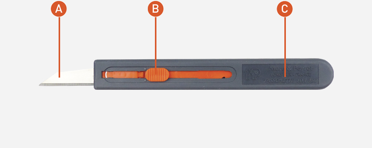 A : Easy blade change from the front. B : Blade exit slider. C : Composite body.