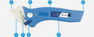 A : Metal pin for tearing off packaging tape. B : Can be hung from the “Zicou“. C : Hybrid body, part magnesium, more resistant, and part composite. D : Secure blade outlet for cutting. E : Tearing tip. F : Blade for stripping. G : Rear blade locking bolt. H : Slider for rear blade extension and change.