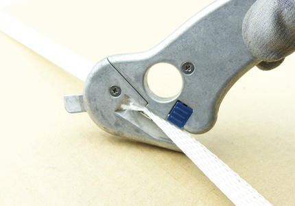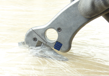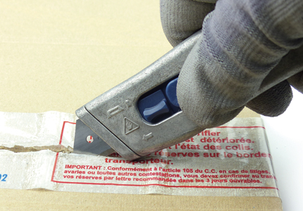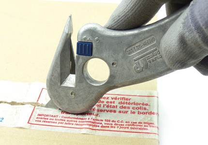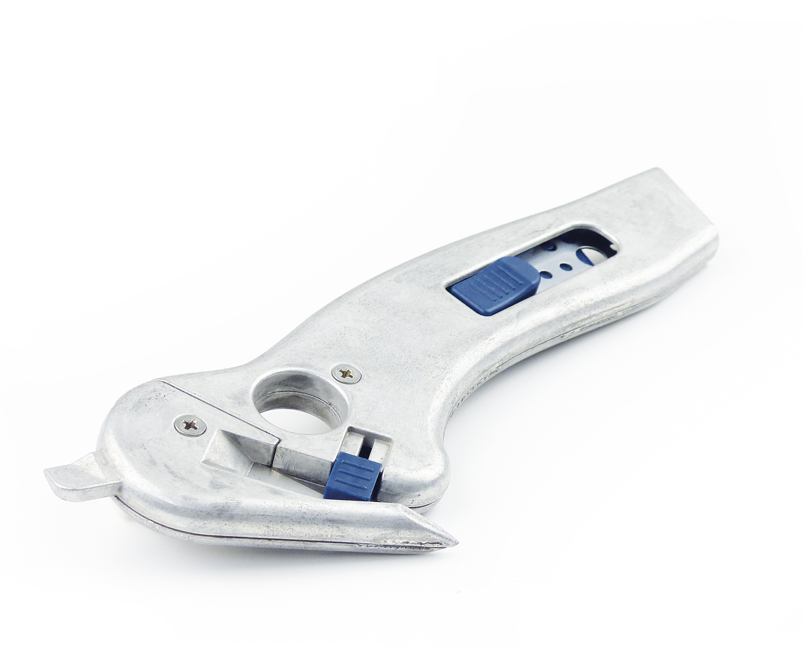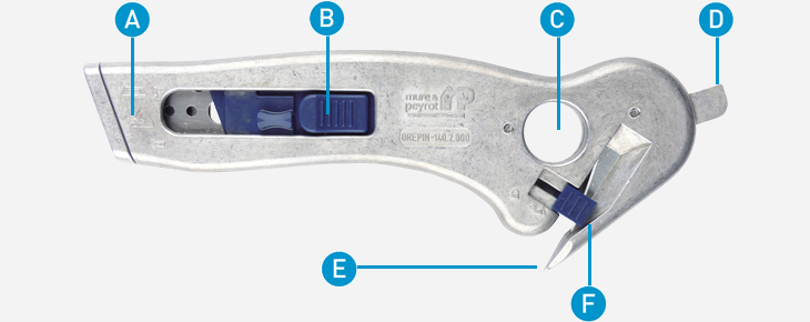 A : Rear blade exit. B : Rear blade output cursor serrated. C : Can be hung from the Zicou D : Metal tearing pin. E : Tip for perforate plastic films F : Safety device to lock the rear blade.