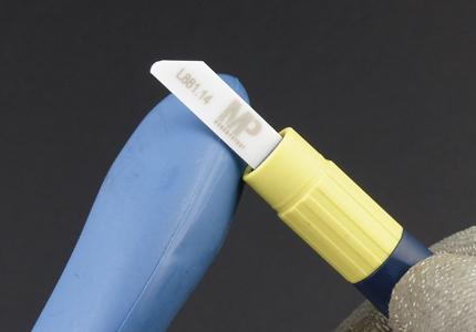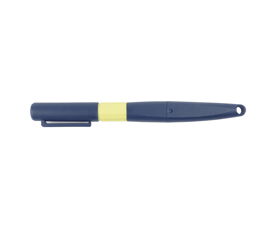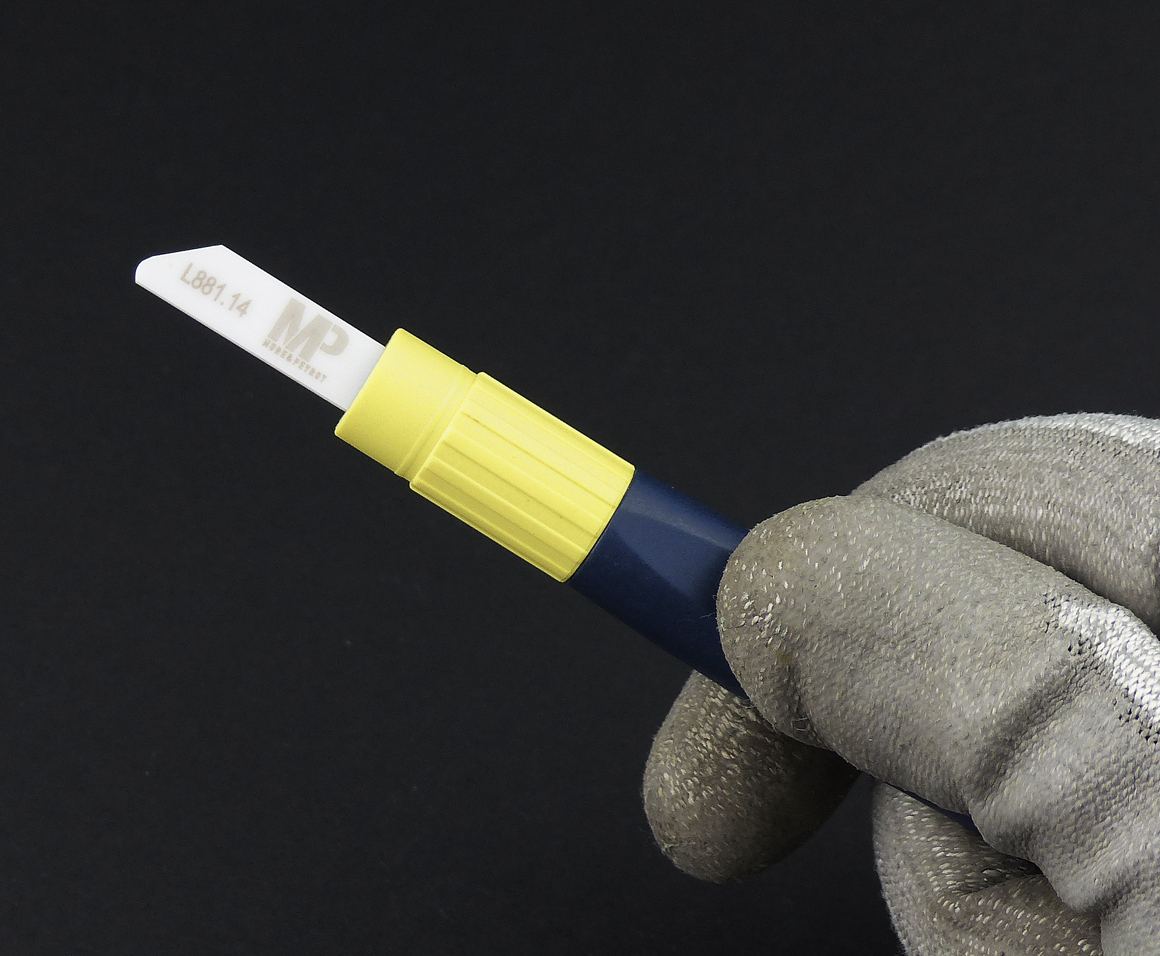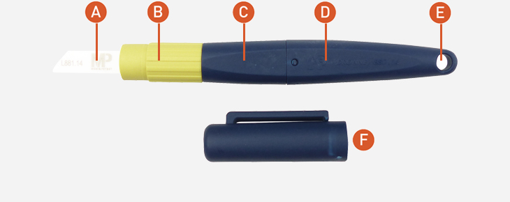 A : Unsharpened ceramic blade. B : Blade clip ring. C : Non-circular section that prevents it from rolling. D : Blade reserve possible. E : Can be hung from the Zicou