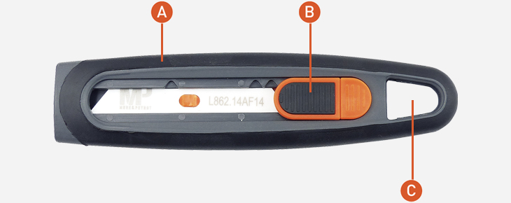 A : Bi-material body. B : Anti-slip bi-material slider with locking system. C : Can be hung from the Zicou.