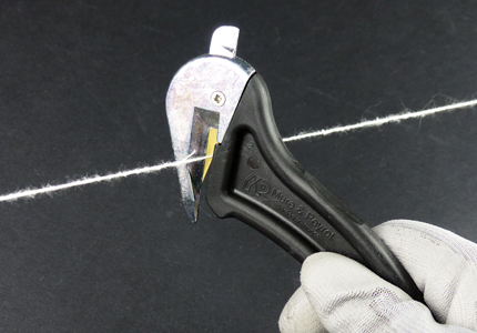 A : Non-cutting metal spur for tearing adhesives. B : Thumb rest. C : Can be hung from the Zicou. D : TIN coated high quality steel blade. E : Tip for perforate the plastic films.