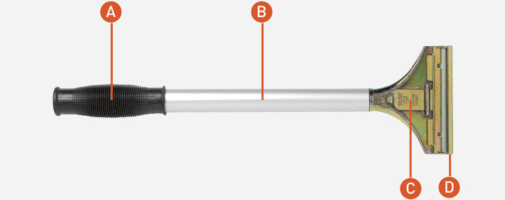 A : Serrated handle. B : Metal handle. C : Lever slider for fixing the blade. D : Blade protection.