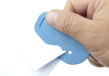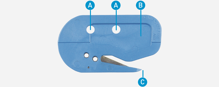 A : Holes for positioning the Porge ALD. B : Great thickness for the rigidity of the knife. C : Tip for perforate the plastic films.