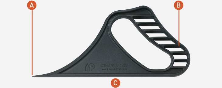 A : Ergonomic and fine tip in the shape of a duck beak. B : Ergonomic handle for more comfort and good handling. C : Long support area.