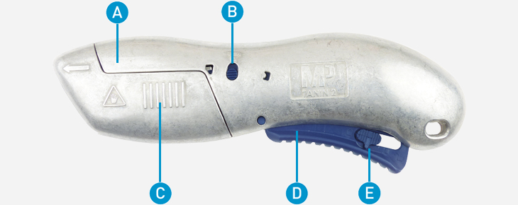 A : Manche ergonomique. B: Poussoir pour ôter la trappe et avoir accès à la lame. C : Loquet de déverrouillage de la trappe. D : Gâchette. E : Curseur de blocage au repos. D : Possibilité de l’accrocher au Zicou