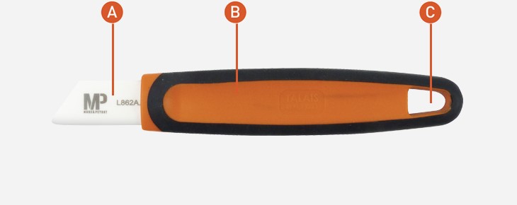 A : Lame céramique non aiguisée. B : Bi-matière pour plus de confort. C :Possibilité de l’accrocher au Zicou.