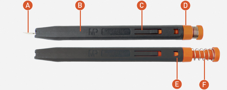 A : Changement de lame facile par l’arrière. B : Corps en matière composite. C : Clip pour rentrer la lame. D : Bague de verrouillage de la lame. E : Clip pour changer la lame. F : Curseur de sortie de lame.