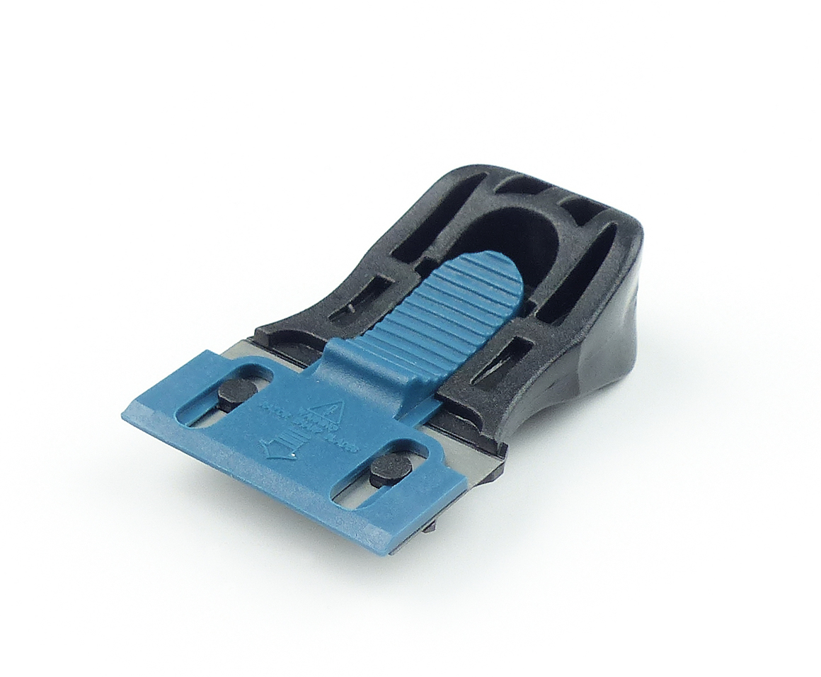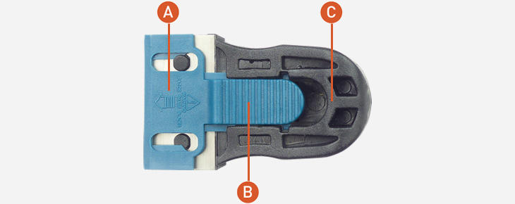 A : Capot amovible protecteur de la lame. B : Curseur strié pour une meilleure manipulation du capot. C : Ergonomie spécialement étudiée.