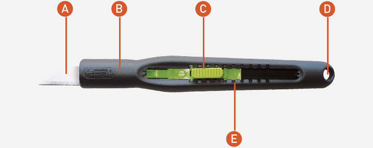 A : Changement de lame par l’avant. B : Manche ergonomique. C : Curseur antidérapant et autobloquant. D : Possibilité de l’accrocher au Zicou. E : Crans de position du curseur pour réglage de la lame.