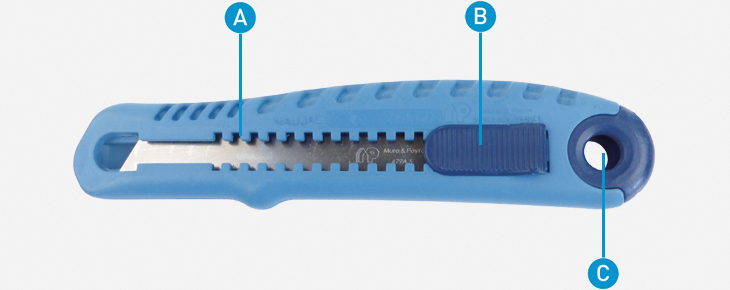A : Crans de position du curseur pour régler la sortie de lame. B : Curseur auto-bloquant, strié et antidérapant. C : Possibilité de l’accrocher au Zicou.