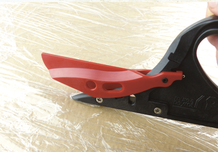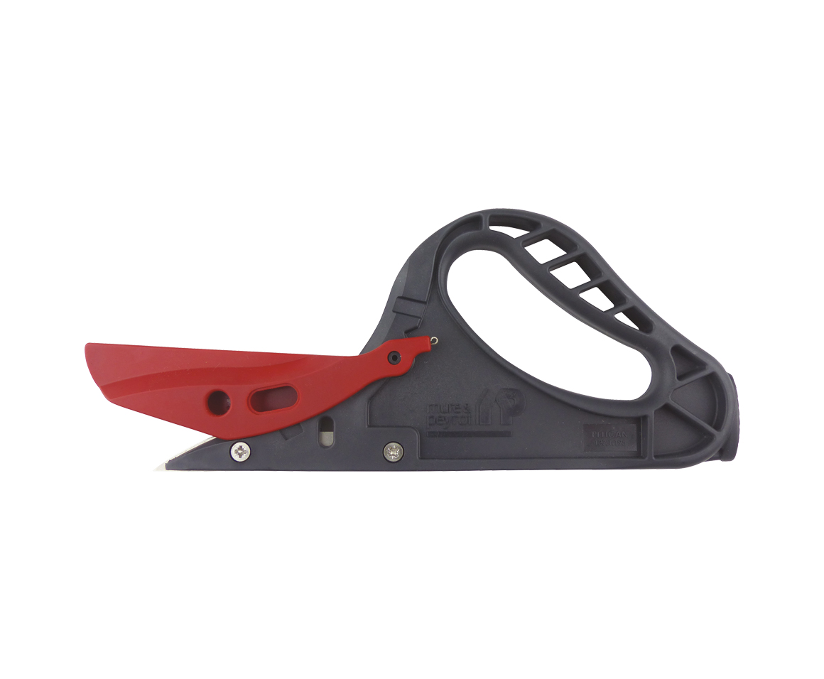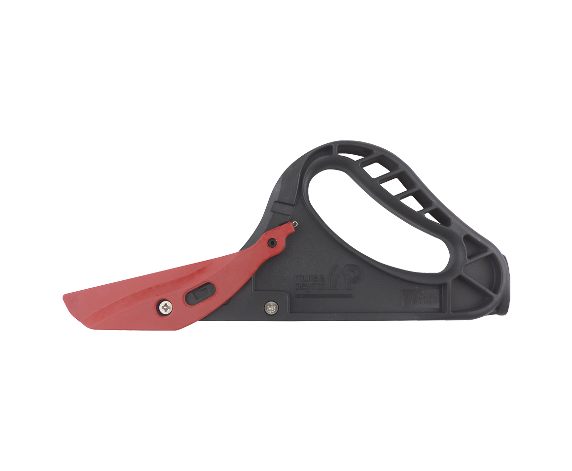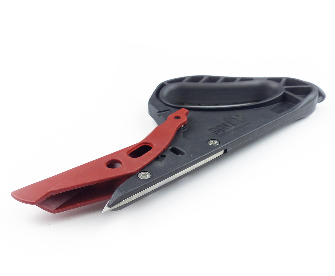 A : Protection de lame amovible. B : Mouvement du capuchon actionné par ressort. C : Manche ergonomique. D : Bonne prise en main du couteau grâce à la poignée.