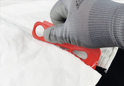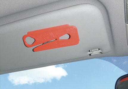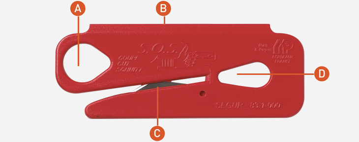 A : Crochet tire doigt. B : Arête latérale permettant de gratter le givre sur les pare-brises. C : Aucun contact possible avec la lame. D : Possibilité de l’accrocher au Zicou.