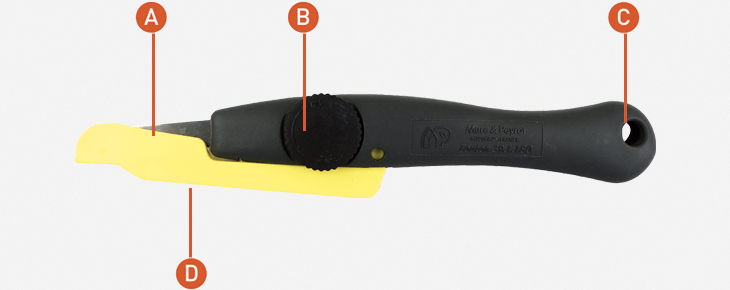 A : Lame en acier. B : Protecteur de la lame. C : Molette pour changer la lame. D : Possibilité de l’accrocher au Zicou.