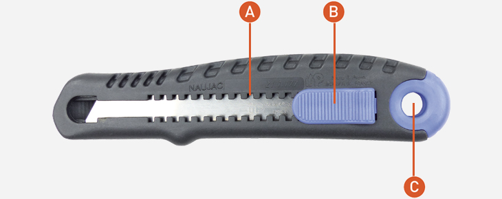 A : Crans de position du curseur pour réglage de la sortie de lame. B : Curseur strié antidérapant. C : Possibilité de l’accrocher au Zicou