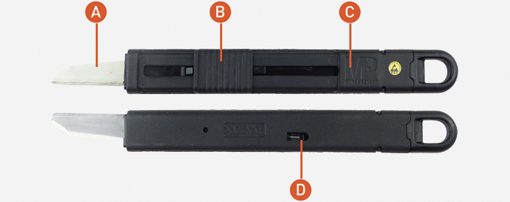 A : Changement de lame facile, par l’avant. B : Curseur de sortie de lame. C : Corps en matière composite conductrice. D : Clip pour le changement de lame.