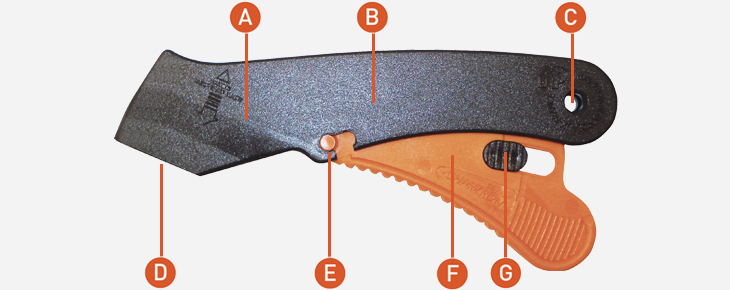 A : Manche ergonomique. B : Ressort de rappel interne en inox. C : Possibilité de l’accrocher au Zicou. D : Sortie de lame réglable. E : Ergot de fixation de la gâchette. F : Gâchette va et vient et support de la lame. G : Curseur de blocage au repos.