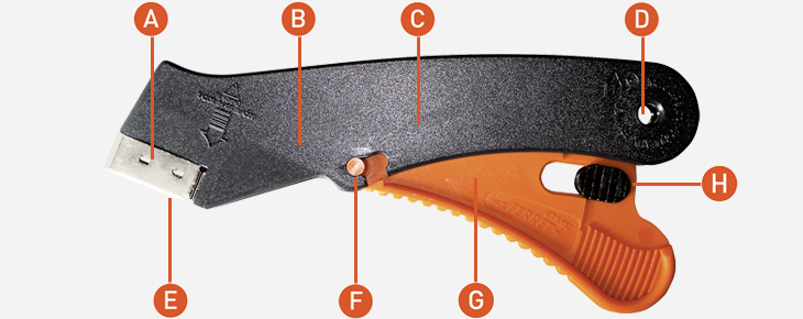 A : Renfort métallique qui évite l’usure prématurée lors de la coupe intensive de cartons abrasifs. B : Manche ergonomique. C : Ressort de rappel interne en inox. D : Possibilité de l’accrocher au Zicou. E : Sortie de lame réglable. F : Ergot de fixation de la gâchette. G : Gâchette va et vient et support de la lame. H : Curseur de blocage au repos.