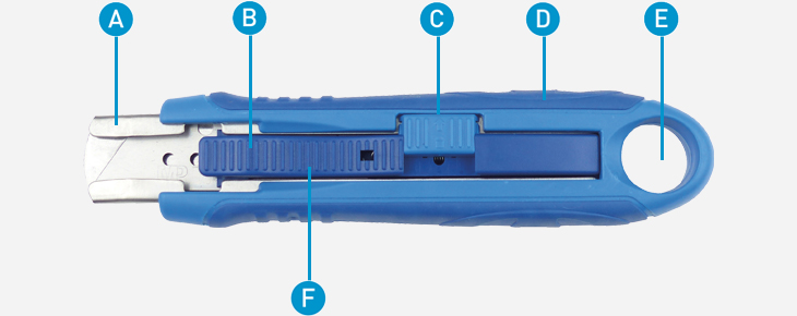 A : Intérieur et tête métal. B : Changement de la lame facile par l’avant. C : Verrou de blocage au repos. D : Bi-matière : améliore le confort. E : Possibilité de l’accrcher au Zicou. F : Curseur strié antidérapant.