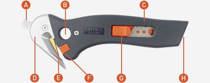 A : ergot en métal pour déchirer les adhésifs d’emballage. B : possibilité de l’accrocher au « Zicou« . C : corps hybride, un partie en magnésium, plus résistant, et en composite. D : bec pour déchirer. E : lame pour dessangler. F : verrou de blocage de la lame arrière. G : curseur pour sortie et changement de lame arrière. H : sortie de lame sécurisée pour découper.