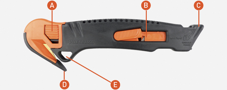 A : Bouton poussoir pour libérer le capot de tête et changer la lame. B : Curseur de sortie de la lame arrière. C : Sortie de lame arrière sécurisée. D : Pointe pour percer les films plastiques. E : Possibilité de l’accrocher au Zicou.
