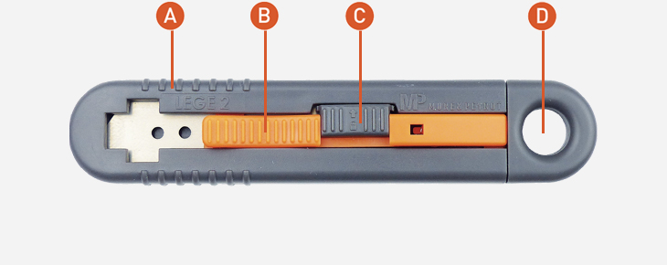 A : Manche réalisé d’une seule pièce. B : Curseur strié. C : Verrou de blocage de la lame D : Possibilité de l’accrocher au Zicou