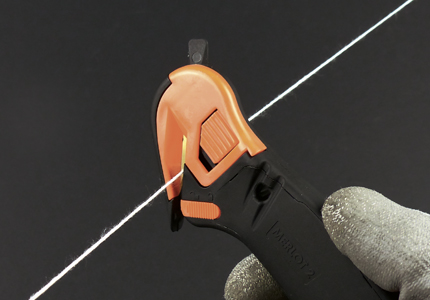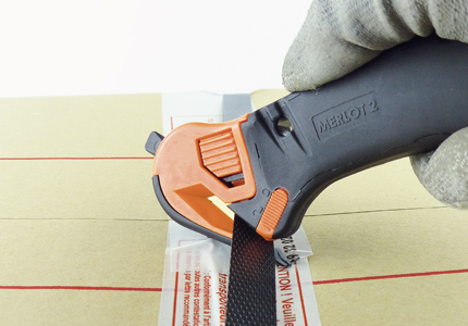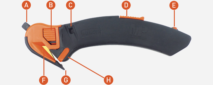 A : Ergot pour déchirer. B : Poussoir pour ouvrir le capot et changer la lame. C : Possibilité de l’accrocher au Zicou. D : Curseur de sortie de lame arrière. E : Curseur pour changer la lame arrière. F : Lame revêtue TIN. G : Bec pour dessangler et defilmer. H : Verrou de sécurité pour libérer la lame arrière.