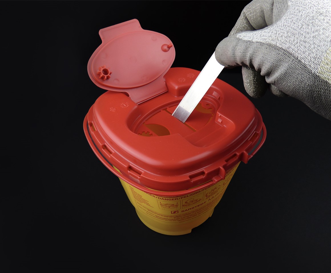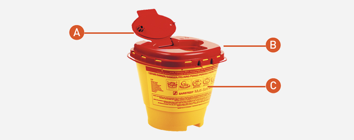 A : Couvercle du récupérateur de lames usagées. B : Ouverture pour insérer les lames usagées. C : Récupérateur de lames.